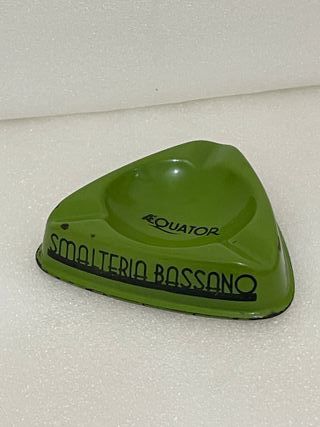 Posacenere pubblicitario in metallo smaltato. - Design triangolare. - Colore verde. - Logo EQUATOR. - Scritta SMALTERIA BASSANO.