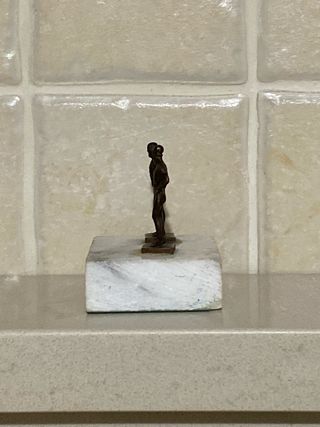 Scultura: rara opera in miniatura dei famosi Bronzi di Riace. - Scultura in lega (bronzital). - Base in marmo e placca dorata. - Ispirato ai Bronzi di Riace, V secolo a.C. - Provenienza: Calabria, Italia.
