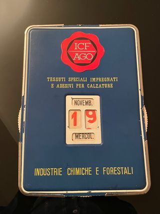 Calendario perpetuo da tavolo con design vintage. - Logo ICF AGO. - Scritta TESSUTI SPECIALI IMPREGNATI E ADESIVI PER CALZATURE. - Indicazione NOVEMB. 19 MERCOL.. - Scritta INDUSTRIE CHIMICHE E FORESTALI sul fondo. condizioni ottimali come da foto. dimensioni 34 x 24,5 cm materiale cartone con funzionamento rotelle ai lati in cartone