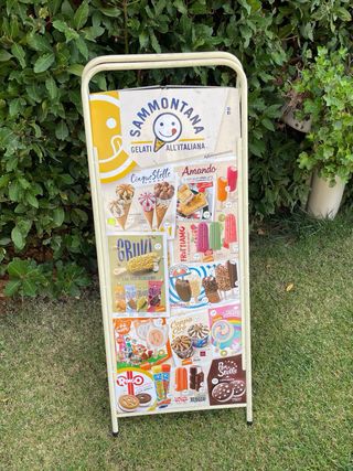 Display pubblicitario Sammontana per gelati. - Grafica colorata con vari gusti di gelato. - Logo Sammontana Gelati All'Italiana. tabella insegna in metallo