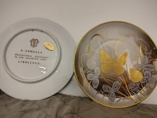 Set di due piatti decorativi con finiture in oro 24kt. Marca Comolla in fine porcellana lavorata a mano. Articolo da gioielleria. Il prezzo è riferito a entrambi gli articoli - Un piatto presenta una farfalla dorata su sfondo bianco e sfumature marroni. - L'altro piatto raffigura due libellule dorate con dettagli floreali. - Bordo su entrambi i piatti.