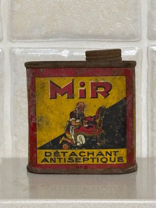 Lattina d’epoca vintage del prodotto Mir Detachant Antiseptique. Si tratta di un pezzo da collezione che testimonia la pubblicità d'epoca. Il design presenta un'illustrazione retrò tipica dei prodotti per la casa della metà del XX secolo. Il prodotto è identificato come "Détachant Antiseptique" (Smacchiatore Antisettico) N° 2. Le foto sono parte integrante della descrizione. Oggetto visto e piaciuto da fotografie e nello stato attuale delle condizioni di uso sempre da fotografie.