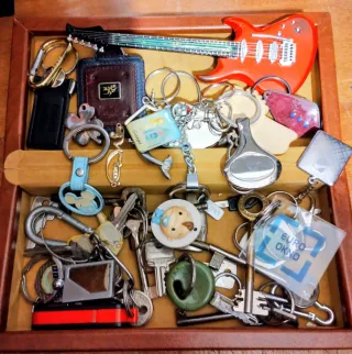 Lotto misto di portachiavi con diversi ciondoli, Vecchie chiavi , chitarra accendino, - Portachiavi a forma di chitarra rossa. - Portachiavi con orologio. - Portachiavi con delfino. - Portachiavi con quadrifoglio. - Portachiavi con figura di bimbo/a. Compreso cofanetto in pelle 23x 13 cm, in ottime condizioni.