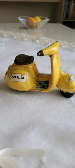 Deliziosa Vespa in ceramica di Caltagirone, dipinta a mano con vivaci colori. - Decorazione floreale sul fianco. - Dettagli come le prese d'aria e il cruscotto sono finemente realizzati. - Un pezzo unico che porta un tocco di artigianato siciliano.