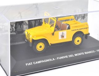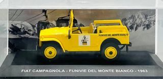 Modellino Fiat Campagnola del 1963, utilizzato per le Funivie del Monte Bianco. MODELLINO IN METALLO SCALA 1:43 SENZA FASCICOLO - Colore giallo vivace. - Dettaglio logo Funivie del Monte Bianco. - Sfondo con panorama montano e funivia.