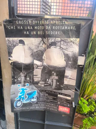 Poster pubblicitario originale Aprilia del 1998. - Promozione Grosse Offerte Aprilia. - Grafica con due uomini su scooter. - Testo Chi ha una moto da rottamare, ha un bel sedere. - Dettagli offerta Rally Aria e Finanziamenti e Sconto Rottamazione. - Scadenza offerta 30/06/98.
