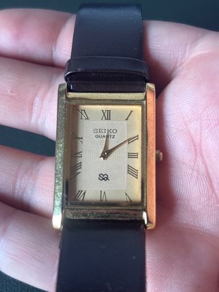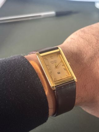 Elegante orologio Seiko con cassa dorata e movimento al quarzo. - Cassa rettangolare dorata. - Cinturino in pelle marrone. - Quadrante con numeri romani. - Perfettamente funzionante