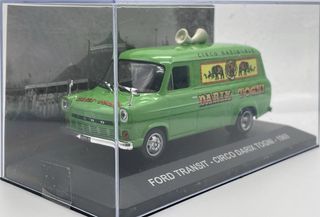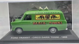 FORD TRANSIT CIRCO DARIX TOGNI 1969ODELLINO IN METALLO SCALA 1:43 SENZA FASCICOLO Veicolo: Ford Transit - Decorazione: Circo DARIx TOGNI - Anno: 1969 - Colore: Verde brillante - Dettagli: Grafiche a tema circense con elefanti e tigre, scritta CIRCO NAZIONALE sul tetto.