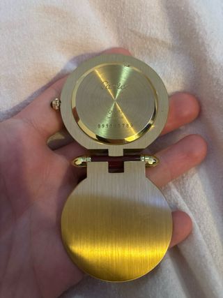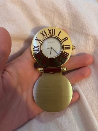 Elegante orologio da tavolo Cartier con movimento al quarzo non funzionante( pezzo dal collezione). Un pezzo raffinato per ogni ambiente. - Design circolare in metallo dorato. - Quadrante bianco con numeri romani. - Logo Cartier visibile sul quadrante.