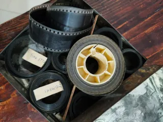 Contenitore vintage per pellicole cinematografiche, ideale per conservare vecchi filmati. - Scatola in metallo. - Include bobine e pellicole. - Etichette FINE 1970 e DOMANI visibili.