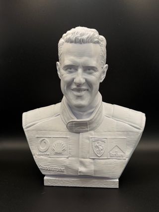 Busto stampato in 3D che raffigura Michael Schumacher. Un pezzo da collezione per gli appassionati. - Altezza: 25 cm. - Materiale: Plastica. - Dettagli fedeli alla tuta da corsa.