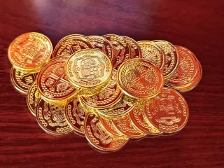 Set di 25 monete dorate castigliane dell'epoca coloniale. Perfette per l'uso in giochi da tavolo o per collezionismo. Materiale in plastica resistente, 3 cm.