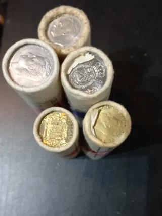 Lote di 5 cartucce di monete Peseta. 2 cartucce da 50 monete da 5 pesetas, emissione 15-12-75. 50 monete da 2 pesetas, 1982. 50 monete da UNA PESETA, emissione 19-12-75. 50 monete da UNA PESETA, emissione 8 luglio 1963.*74