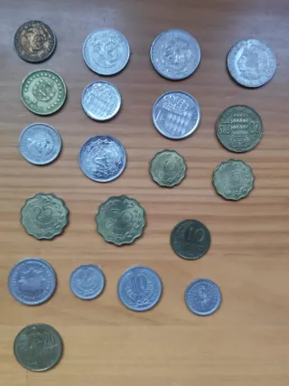 Set di 20 monete da diversi paesi. 5 centavos del Messico del 1959. 25 centavos del Messico del 1964. 50 centavos del Messico del 1976. 1 peso dell'Uruguay del 1965. Mezzo franco di Monaco del 1968. 1 franco di Monaco del 1968. 20 franchi di Monaco del 1950. 10 centavos del Nicaragua del 1950. 25 paisa del Nepal del 1987. 10 céntimos del Paraguay del 1953. 15 céntimos del Paraguay del 1953. 25 céntimos del Paraguay del 1953. 50 céntimos del Paraguay del 1953. 10 céntimos del Perù del 1965. 5 céntimos dell'Uruguay del 1936. 2 céntimos dell'Uruguay del 1953. 10 céntimos dell'Uruguay del 1960. 25 céntimos dell'Uruguay del 1960. 20 céntimos di Monaco del 1962.