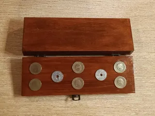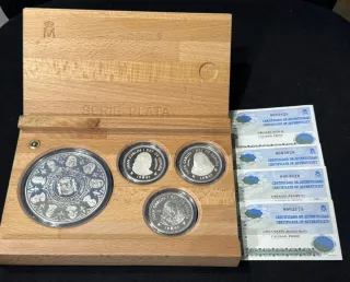 Set di monete d'argento della Serie Argento, presentato in una scatola di legno. Include una moneta grande e tre monete piccole. Ogni moneta è accompagnata dal suo certificato di autenticità. Le monete piccole sono da 8 Reales (Luis I), 8 Reales (Felipe V) e Cincuentín (Ritratto Reale). La moneta grande commemora il III Centenario della Casa di Borbone. Anno delle monete piccole: 1997.