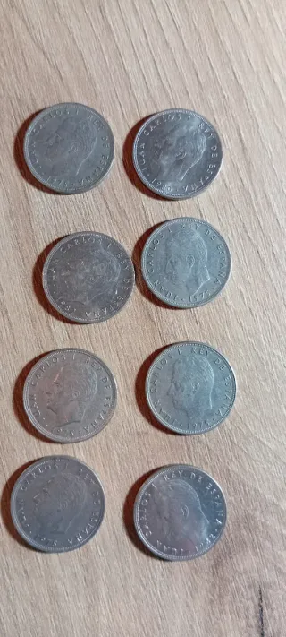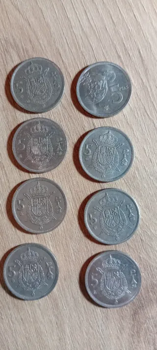 Set di 8 monete da 5 pesetas. Ogni moneta ha un valore di 5 pesetas. Design con scudo e corona.