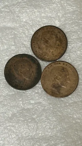 Set di tre monete antiche da dieci centesimi in rame e nello stato mostrato nelle foto. - Monete di Alfonso XII - Anni visibili: 1877, 1879 e 1879. - Design con il profilo del re.