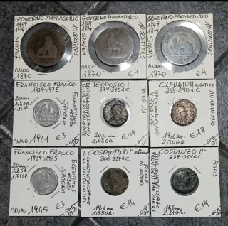 9 monete di cui 4 romane e 5 Spagnole. Claudio II, Teodosio, Costanzo II, Costantino I. Periodo 268-395 dC Governo provvisorio, Francisco Franco