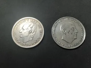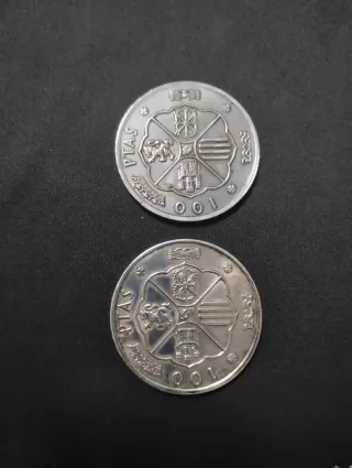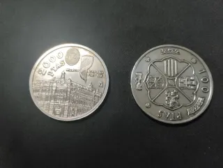 In vendita due monete d'argento dell'era di Franco. - Design con stemma e valore 100. - Inciso PTAS su un lato.