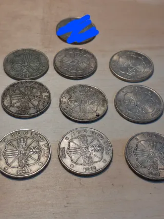 In vendita lotto di 9 monete da 100 pesetas dell'epoca di Franco. Argento. - Monete da 100 pesetas. - Lotto di 9 unità. - Design con stemma della Spagna.
