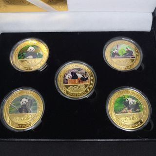 Collezione di 5 monete di Panda Gigante, bagnate in oro e presentate in un astuccio. INCLUSE CAPPSULE PROTETTIVE
