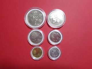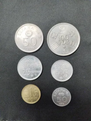 VENDO: Lotto n. 15. Collezione di 6 monete del 1980-82 Mondiali 82, tutte come nuove, incapsulate e in bustine di plastica individuali per evitare graffi. 1 moneta da 100 Ptas. 1980-80, 1 moneta da 50 Ptas. 1980-82, 1 moneta da 25 Ptas. 1980-82, 1 moneta da 5 Ptas. 1980-82, 1 moneta da 1 Pta. 1980-82, 1 moneta da 50 Cts. 1980-80. Disponibili altre collezioni simili. Possibilità di creare lotti per spedizione più economica. Design con il ritratto del Re Juan Carlos I.