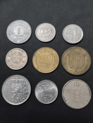 Lottazione varia di monete di diversi paesi ed epoche. - Moneta da 1 Franco del 1947. - Moneta da 2,5 Pesetas. - Moneta da 20 Centimes del 1934. - Moneta da 10 Pesetas. - Moneta da 1/2 Franco. - Moneta da 5 Franchi del Belgio. - Moneta da 1 Fiorino dei Paesi Bassi del 1971.