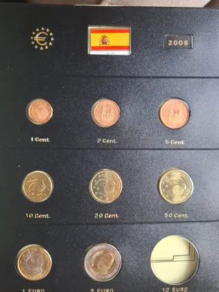 Album marrone con 5 buste marroni, con 43 monete euro, DAL 2006 AL 2010, contiene ogni anno le 8 monete: 1, 2, 5, 10, 20, 50 centesimi, 1 e 2 euro. Inoltre 3 monete commemorative da 2 euro: - 2007 Trattato di Roma - 2009 10 anni UEM - 2010 Alhambra di Granada. SENZA CIRCOLAZIONE. TUTTE NUOVE.