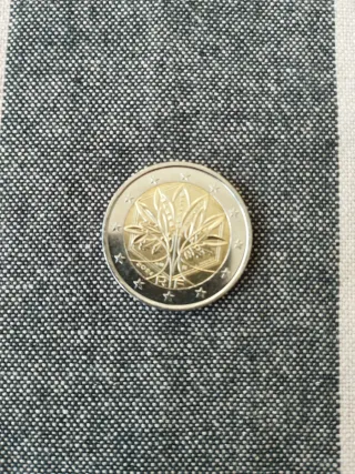 Moneta commemorativa da 2 euro della Finlandia dell'anno 2004. Presenta un design floreale. Valutata tra i 70 e i 100 euro, la vendo a buon prezzo perché ho fretta di venderla. È famosa ed esclusiva poiché ne sono state prodotte solo 758 unità in tutto il mondo. Design: Fiori di Rubus chamaemo. Anno: 1985 di prima produzione.