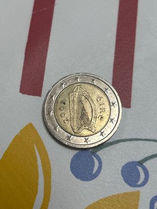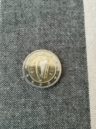 La moneta mostrata è una moneta da 2 euro dell'Irlanda. Il design, opera di Jarlath Hayes, presenta l'arpa celtica, un simbolo irlandese di lunga data. Alla sinistra dell'arpa si trova la parola 'Éire', che significa Irlanda in irlandese. La data si trova a destra dell'arpa. Il valore attuale della moneta è di 2 euro.
