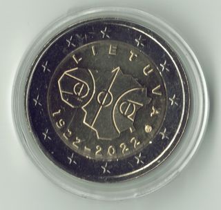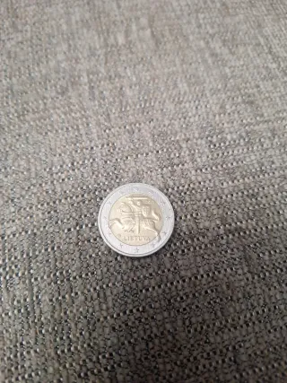 Moneta lituana da 2 euro raffigurante lo stemma nazionale, noto come Vytis. Paese: Lituania. Valore: 2 euro. Anno: 2021. Caratteristiche: Bimetallica, con un nucleo di nichel rivestito in nichel-ottone e un anello di cupronichel. Design: L'anello esterno presenta le dodici stelle dell'Unione Europea.