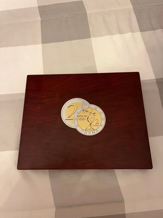 Portamonete in legno per conservare monete da due euro. Design commemorativo dei Giochi Olimpici di Atene 2004. Finitura in legno scuro.