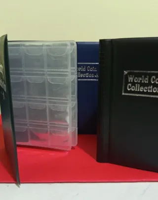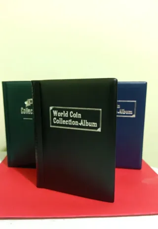 Set di tre album per collezionare monete. - Un album nero con il titolo World Coin Collection-Album. - Un album verde con il titolo Collection. - Un album blu con il titolo -Album.