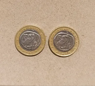 In vendita due monete da 1 Euro della Grecia con il design del gufo. - Design: Gufo di Atena. - Legenda: EYPO. - Anno: 2002 e 2005.