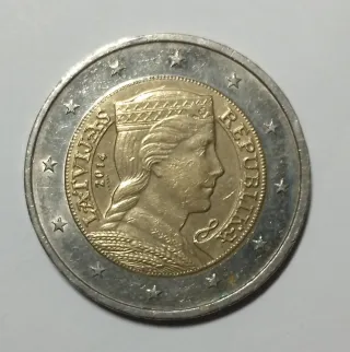 Moneta da 2 euro commemorativa di San Marino del 2023. - Dritto: raffigurante il busto di San Marino. - Rovescio: raffigurante il Monumento alla Repubblica di San Marino. - Anno di coniazione: 2023. - Valore nominale: 2 Euro.