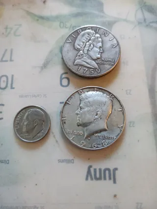 Set di tre monete americane!! - Moneta da 10 centesimi (Dime) con ritratto di Franklin D. Roosevelt. - Moneta da mezzo dollaro (Half Dollar) con ritratto di John F. Kennedy. - Moneta commemorativa della Virginia con ritratto di Martha Washington e data 1759. Quest'ultima è una copia fatta a mano di questa iconica moneta!! Le altre due sono autentiche! Quelle che si vedono nelle foto! Spese di spedizione a parte!