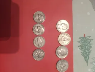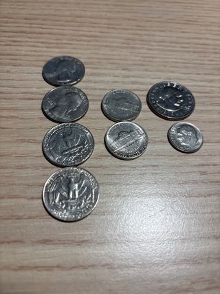 8 monete americane, 5 quarti di dollaro 1973,1983,1989,1998,2002, 1 five cent 1996, 2 One cent 1979,1944.