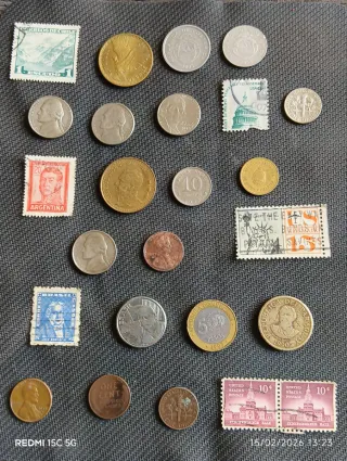 Collezione di monete e francobolli antichi di diversi paesi. Include monete di: Stati Uniti (centesimi, dime, nickel), Argentina, Costa Rica, Paraguay, Repubblica Dominicana, Brasile. Include anche vari francobolli antichi di: Stati Uniti (Independence Hall, Statua della Libertà), Argentina, Brasile, altri. Stato: monete circolate, come si vedono nelle foto. Ideale per collezionisti o per iniziare una collezione.