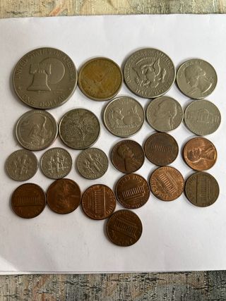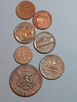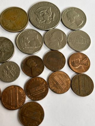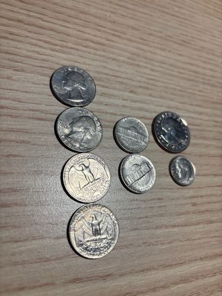 Set di monete degli Stati Uniti d'America. 🇺🇸 - Include un quarto di dollaro (Quarter Dollar). - Include un dime (Dieci centesimi). - Include un nickel (Cinque centesimi). - Include varie monete da un centesimo (Penny).