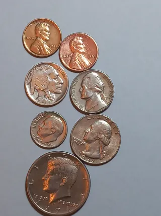 Lotto di varie monete americane. - Moneta del 1945 da 1 centesimo in grano - Moneta del 1982 da 1 centesimo Lincoln - Moneta del 1964 da 5 centesimi Jefferson - Moneta del 1971 da mezzo dollaro Kennedy - Moneta del 1916 da 5 centesimi Indian-Buffalo - Moneta del 1968 da 10 centesimi Roosevelt - Moneta del 1982 da 25 centesimi Washington