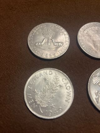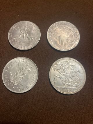 Set di quattro monete antiche di varie nazioni e date, perfette per collezionisti. - Moneta repubblica boliviana Bolivar 1838 - Moneta con aquila United status of america dollar 1804 - Moneta New Zealand Crown 1949. - Moneta sterlina inglese datata 1887.