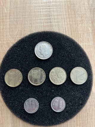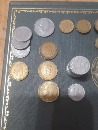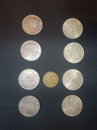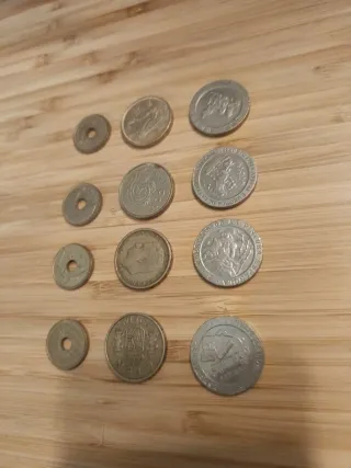 Set di monete spagnole dell'epoca delle peseta. Alcune presentano dettagli incisi. Si vende il pacchetto completo.