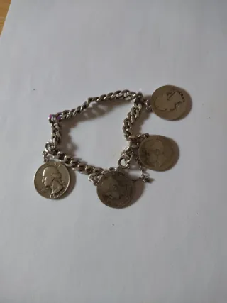 Bracciale elegante con catena a maglie e cinque monete antiche come ciondoli. Materiale: Argento. Design: Catena a maglie cubane. Adorni: Quattro monete antiche. Stile: Classico e senza tempo.