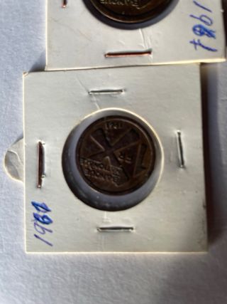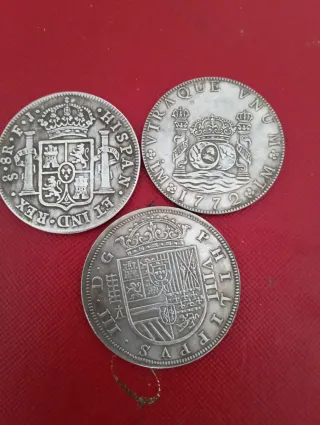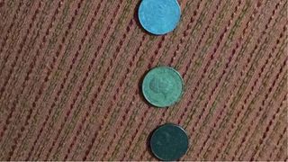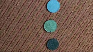 Set di tre monete antiche, ideali per collezionisti. - Moneta di colore blu. - Moneta di colore verde. - Moneta di colore scuro. Ogni moneta viene venduta per 600