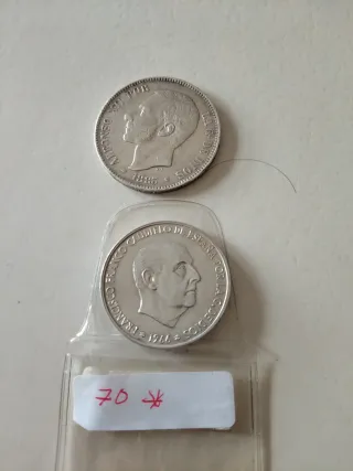 Lotto di due monete antiche della Spagna. - Moneta di Alfonso XIII del 1883 da 5 pesetas. - Moneta di Francisco Franco da 100 pesetas del 1966*70.