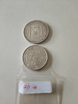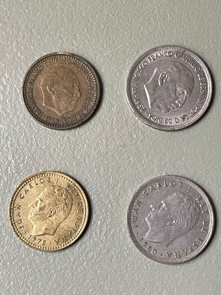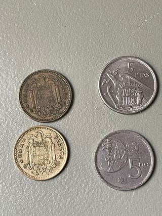 Set di quattro monete antiche spagnole. - Due monete da 1 peseta. - Due monete da 5 pesetas. #monete #moneteantiche