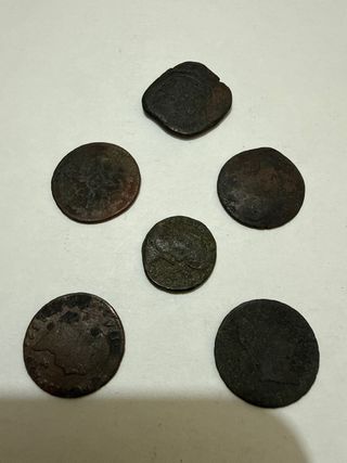 In vendita lotto di 6 monete antiche. - Monete di diverse dimensioni e materiali. - Alcune presentano patina del tempo.