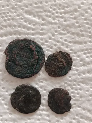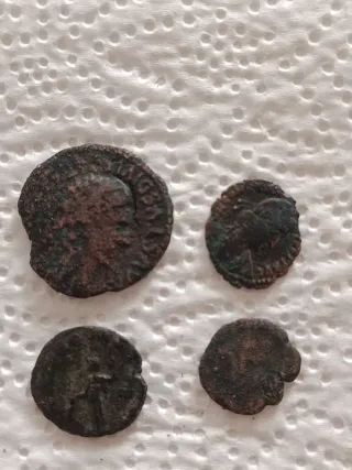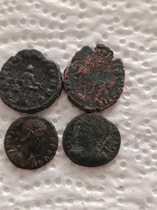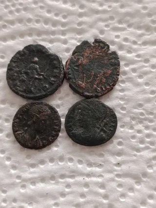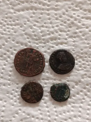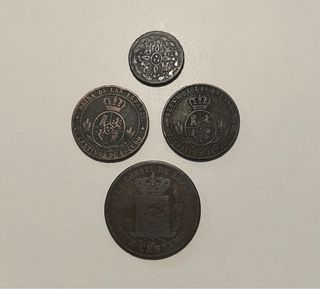 Set di quattro monete antiche, ognuna con il proprio carattere e usura dovuta al tempo. Monete in bronzo o rame con patina. Design e profili storici visibili. Pezzi da collezione per gli amanti della numismatica.