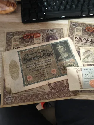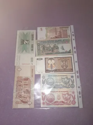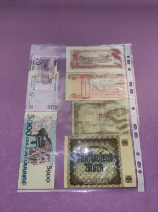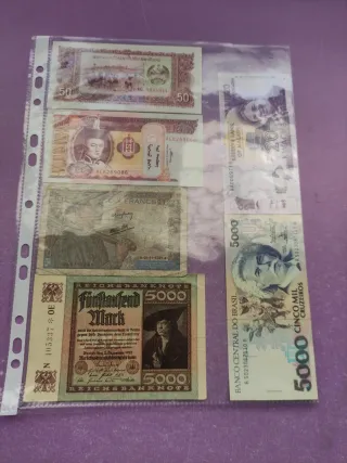 Collezione di banconote antiche di diversi paesi e denominazioni. - Banconote da 50, 5000 e 5000. - Include banconote di Mongolia, Francia, Brasile e Germania. - Diverse serie e numeri di serie.
