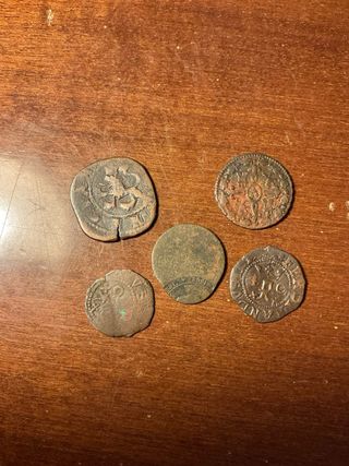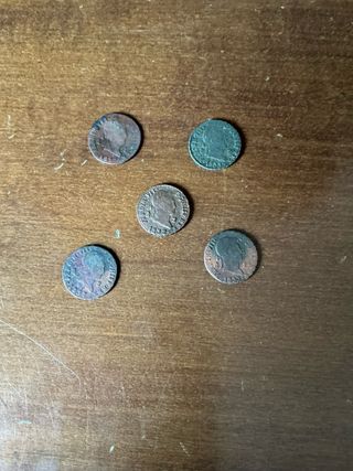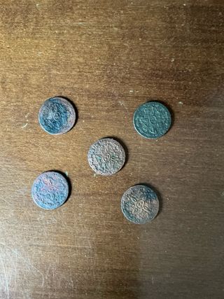Set di cinque antiche monete in rame spagnolo. Ogni moneta presenta un design distintivo. Materiale: rame. Origine: Spagna. Quantità: 5 unità.